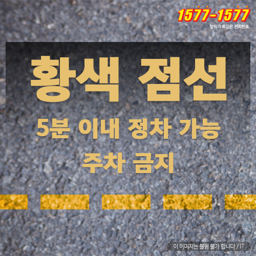 황색점선 노면은 5분 이내의 정차는 가능하지만, 주차는 금지구역입니다.