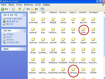 자! 이제 컴퓨터의 내컴퓨터에 들어가보시면 이동식 디스크가 새롭게 나타났지요. 일반적으로 F디스크로 표시됩니다. 안되면 모든 디스크 다 확인해보세요... 흔히들 usb를 사진이나 음악파일,문서파일 등을 저장하기 위해 많이들 쓰시는데요 스마트폰에 보시면 DCIM 과 SAMSUNG이라는 폴더가 보이시죠! DCIM폴더에는 핸드폰으로 찍은 사진들이 저장되는 곳입니다. 그리고 SAMSUNG폴더에는 mp3음악을 저장할 폴더이지요.