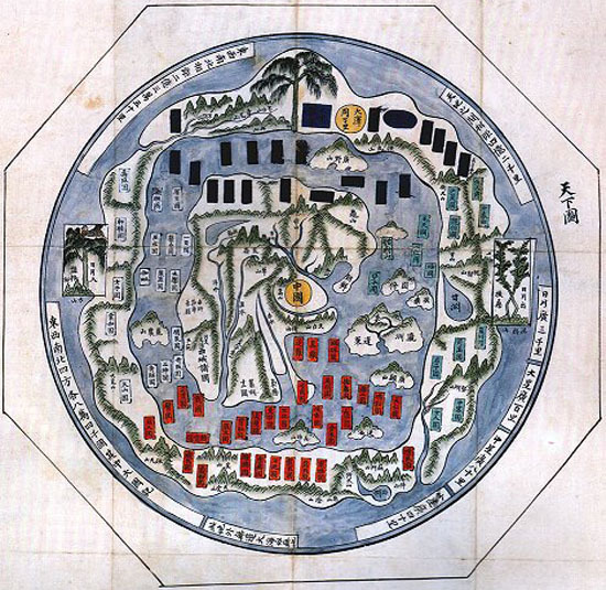 보다시피 천하전여총도에 나타난 중심은 한반도이다. 게다가 그곳이 중심임을 강조하는 수직선까지 나타나 있다. 분명 수직선은 그 이외에 아무런 의미도 없다. 1418년의 원본지도에 나타났는지, 아니면 1763년 모사 당시에 원본지도 상의 중심을 재차 강조한 것인지는 알 수 없지만, 한반도를 중심으로 삼은 것은 틀림없는 사실이며, 그것은 또한 다분히 의도적이자, 의미심장한 일이다.