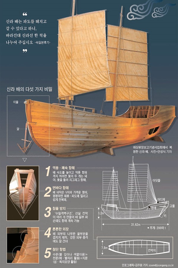 또 신라 배는 튼튼했다. 강상택 전 한국해양대 교수는 “신라 배는 배 측편을 만들 때 판끼리 겹치는 방식으로 한 뒤 참나무 쐐기를 박아 고정시켰을 것”이라며 “일본 배는 판자들을 수평으로 이은 뒤 못으로 고정시켜 약했다”고 설명했다.