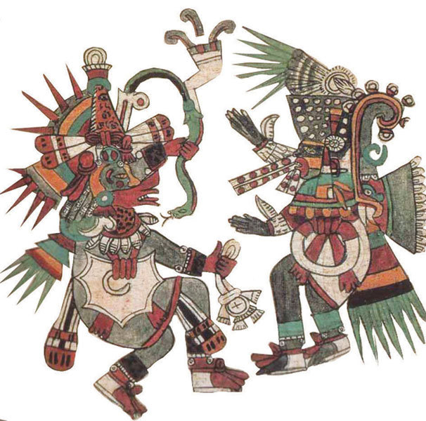 왼쪽이 깃털을 꽂은 케찰코아틀, 오른쪽은 테스카틀리포카이다.