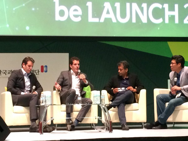 ▲스타트업 콘퍼런스 ‘비론치2014’에서 연사 3명이 비트코인에 관해 얘기를 주고 받고 있다. 왼쪽부터 타일러 윙클보스, 캐머런 윙클보스, 나발 라비칸트 엔젤리스트 대표. 가장 오른쪽 존 남 스트롱벤처스 대표는 사회를 맡았다
