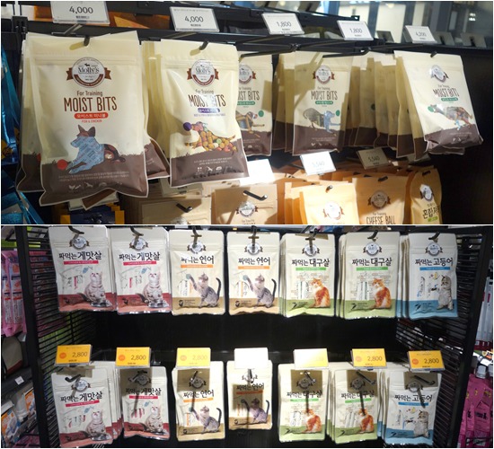 ▲ 대형유통업체에서 판매하는 PB상품은 시중에서 판매되는 상품보다 가격이 저렴하다. 이 때문에 가격경쟁에서 밀리는 중소상인들의 피해가 크다. 사진은 몰리스 펫샵에서 판매하는 반려동물 간식 ⓒ스카이데일리
