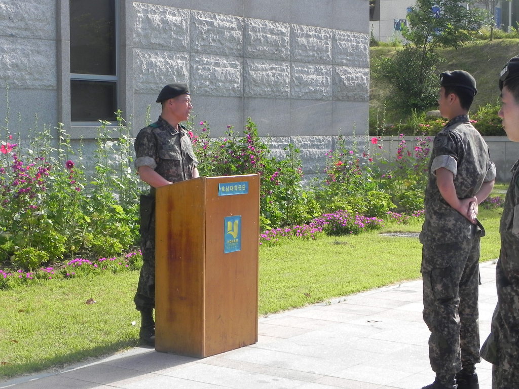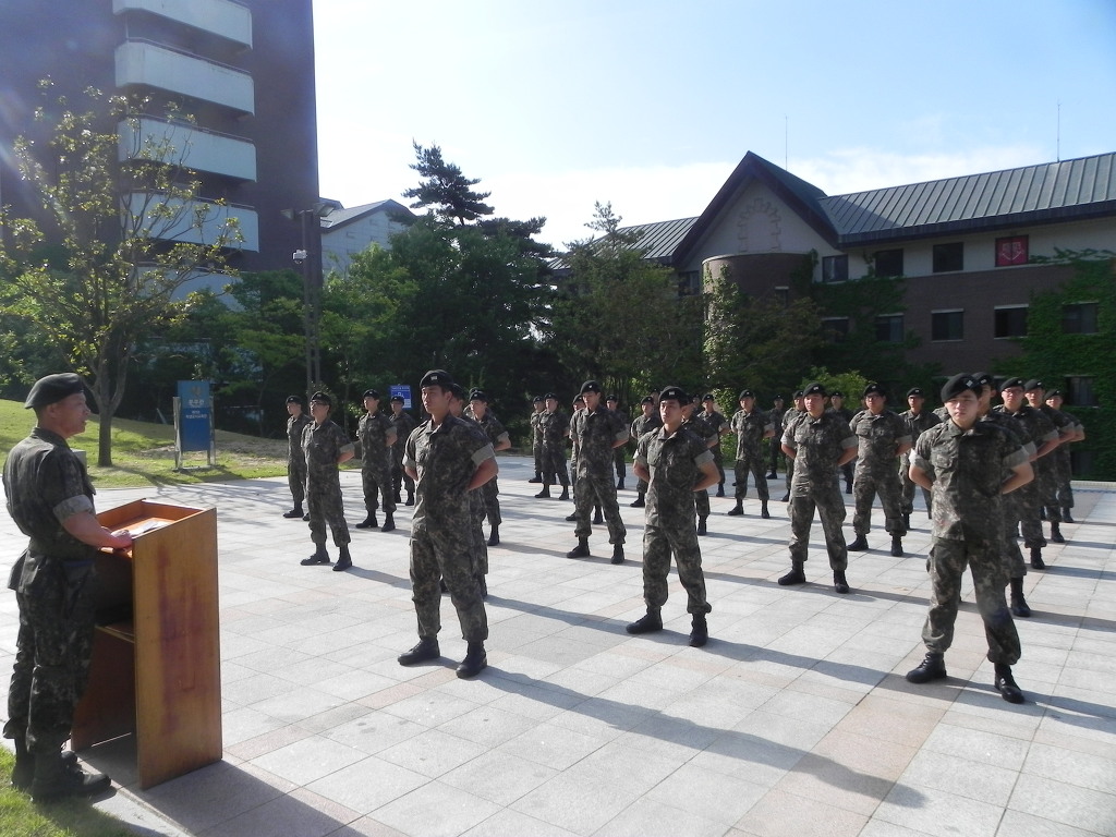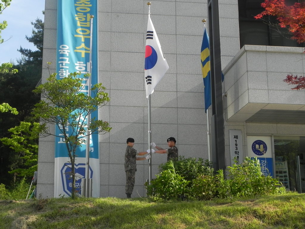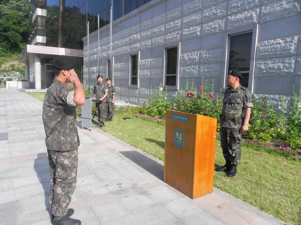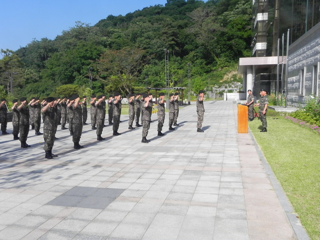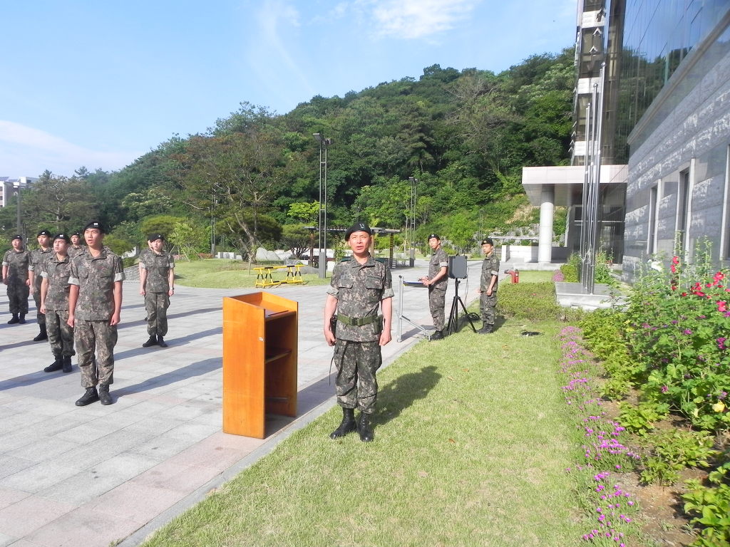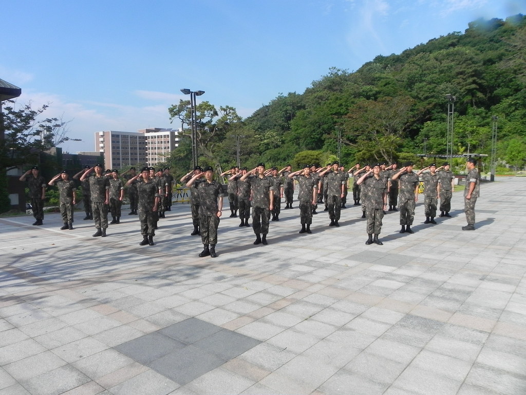합심하여 국기게양식을 준비하였습니다. 모두 한 마음 한 뜻이 되어 군기를 다지는 시간을 가졌습니다.