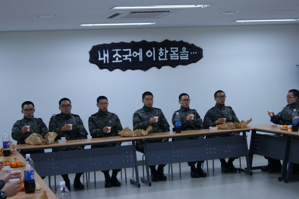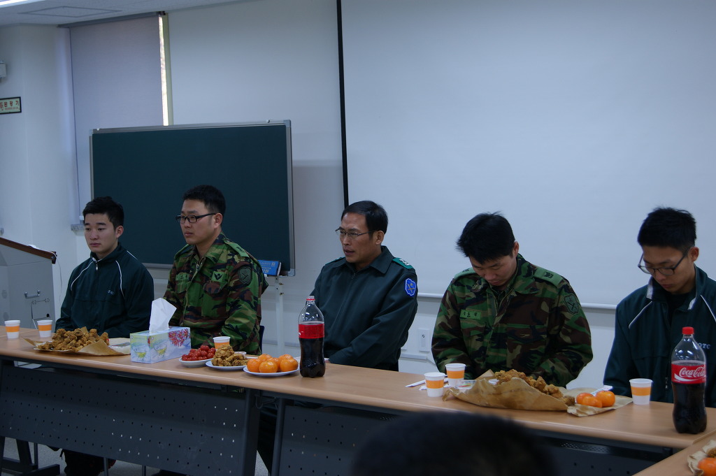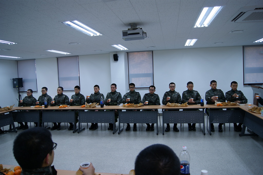 군장검사가 끝나고 훈련을 갈 52기 교육생들과 치킨을 먹기 위해 대강의실에 모여있는 사진입니다.