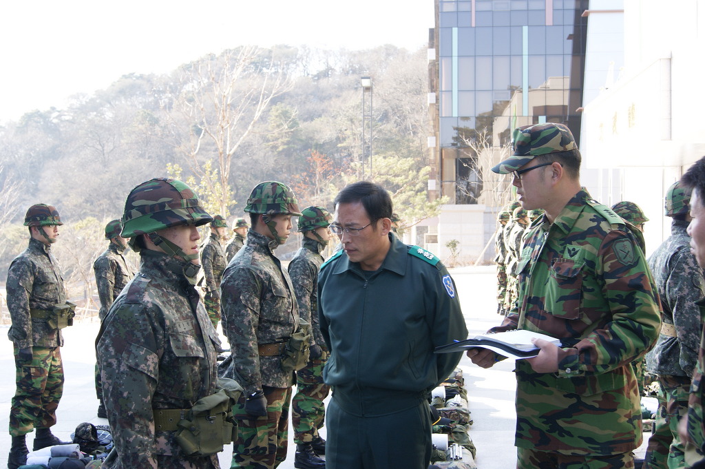 52기 교육생들의 군장물품들을 돌아다니시며 확인하시는 중입니다.