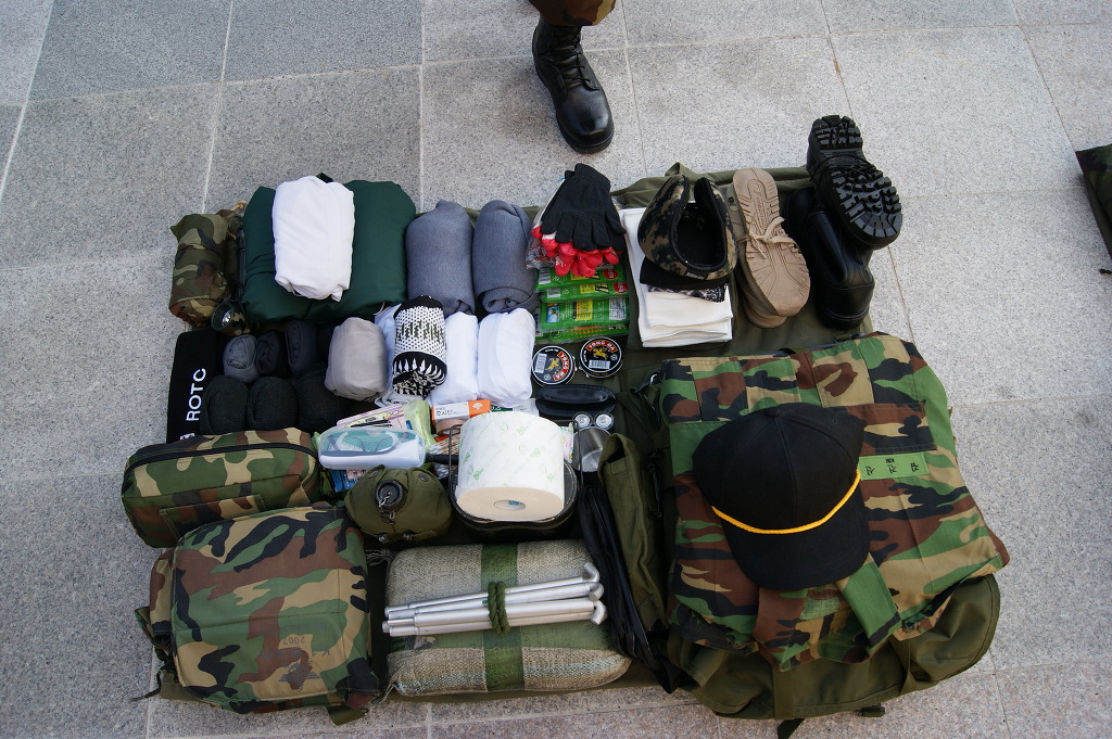 군장검사를 받기 위해 가지런히 정리해놓은 모습입니다.