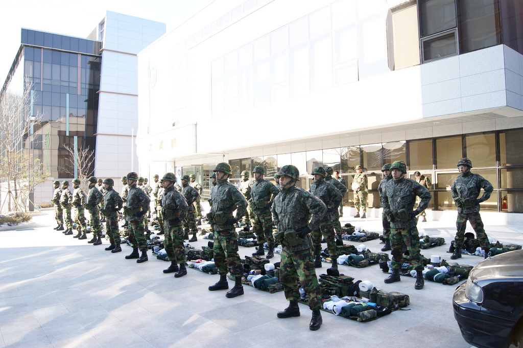 군장검사를 시작하기에 앞서 신고하는 모습