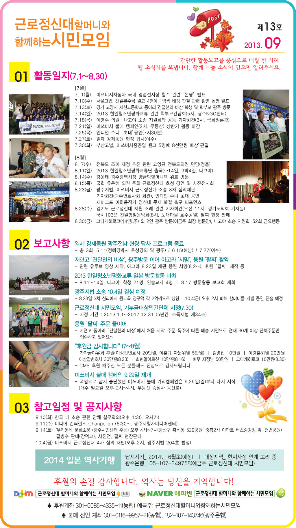근로정신대 시민모임 7~8월 활동 웹 소식입니다. 작성자이국언|작성시간13.09.06|조회수119 목록 댓글 1 글자크기 작게가 글자크기 크게가 사진을 더블 클릭하시면 크게 보실수 있습니다. 다음검색 현재 게시글 추가 기능 열기 북마크 공유하기 신고 센터로 신고 댓글 댓글 1 댓글쓰기 답글쓰기 댓글 리스트 작성자重傳/이희빈 | 작성시간 13.09.12 이 민족들이 1 백만 여 명 이상이 피랍을 당하여서 유린당한 사건도 이렇게 수십 년이 지나 반세기 다 되어가고 있어도 방치하고 있는데 오죽하겠습니까? 그동안 이 땅에서 이러한 일들을 외면하였기에 당하는 수모입니다. 역대 위정자들은 연체이자 가산금은 탕감하고 계산하여 이것부터 갚으시오! 과연 이래도 이 나라에서 민주주의를 한다고 아이들에게 가르칠 수가 있습니까? 댓글 전체보기