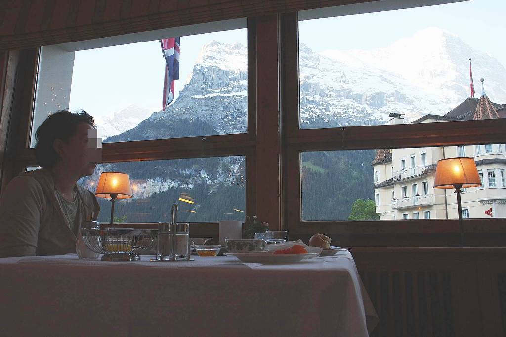 그린델발트의 호텔식당에서 조식때의 눈덮힌아이거산 북벽모습.