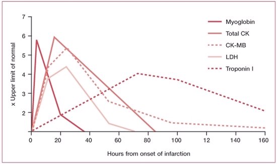 따라서 증상발현 후 4시간 이내에는 myoglobin, CK-MB isoform, CK-MM isoform 을 측정하고, 이후에는 CK-MB와 troponin을 같이 이용하며, 3일 이후에는 LDH 대신 troponin을 이용할 수 있겠다. 단, 민감도 및 특이도는 troponin의 결정수치(cut-off) 결정에 따라 달라진다. 현재로서는 troponin의 측정방법과 장비라든지 각 기관의 적용지침이 다르기 때문에 아직 troponin의 참고치나 결정수치(cut-off)가 표준화되어 있지 않다.