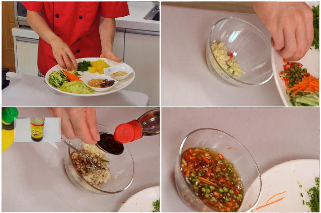 4. 소스 만들기! 다진마늘에 설탕을 넣어 충분하게 섞어줍니다.(삼투입 작용으로 마늘즙이 흘러나오며 그 결과 단시간에 품질좋은 소스를 만들수 있습니다.) 그리고 여기에 느억맘(피시소스), 레몬쥬스, 채썬 당근 약간, 고추, 스위트 칠리소스, 물이나 육수를 혼합하여 섞어줍니다.