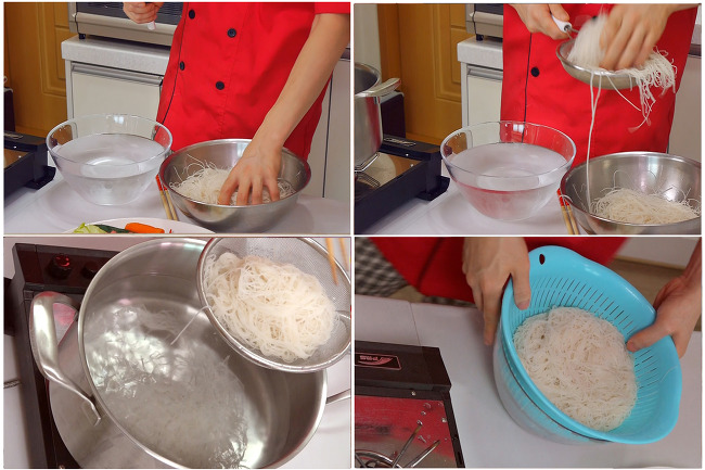 2. 본 요리를 시작하기 전에 쌀국수를 데쳐주세요. 물에 충분히 불린 쌀국수를 끓는물에 잠깐 넣었다가 꺼내는 방식으로 데친 후 찬물에 헹구어줍니다. 급하면 그냥 마른국수 상태로 끓는물에 넣어 삶아도 되요~! 쌀국수는 버미셀리(가장 가는 사이즈)를 추천합니다.
