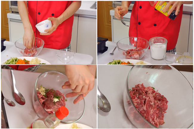 3. 고기를 밑간해요. 쇠고기에 느억맘(피시소스) 1/2큰술, 설탕 1작은술, 후추가루 약간, 마늘, 쪽파 등등을 넣고 잘 무쳐줍니다. 그냥 불고기 양념하듯? 그렇게 하면 됩니다.