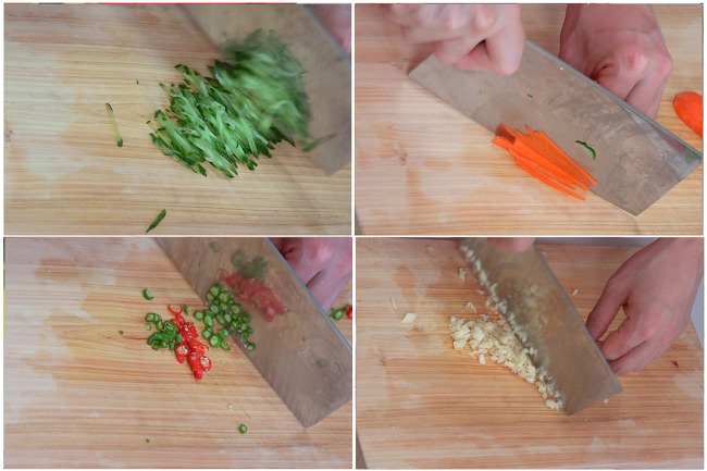 3. 이어지는 액션은 재료손질! 오이, 당근, 양상추 등등을 채썰어주고, 쪽파와 고추는 송송송~! 파인애플은 먹기 좋은 크기로 썰며 마늘은 입자가 보일 정도로 다져줍니다.