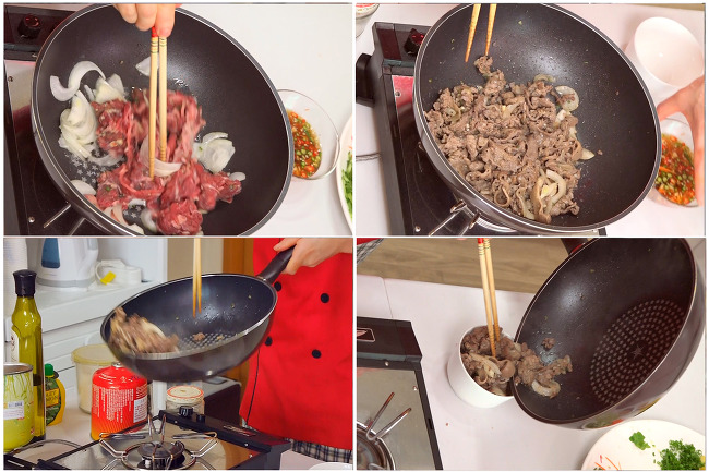 5. 이제 고기를 볶아요. 팬에 기름을 두르고 양념한 쇠고기를 볶아 따로 담아줍니다.
