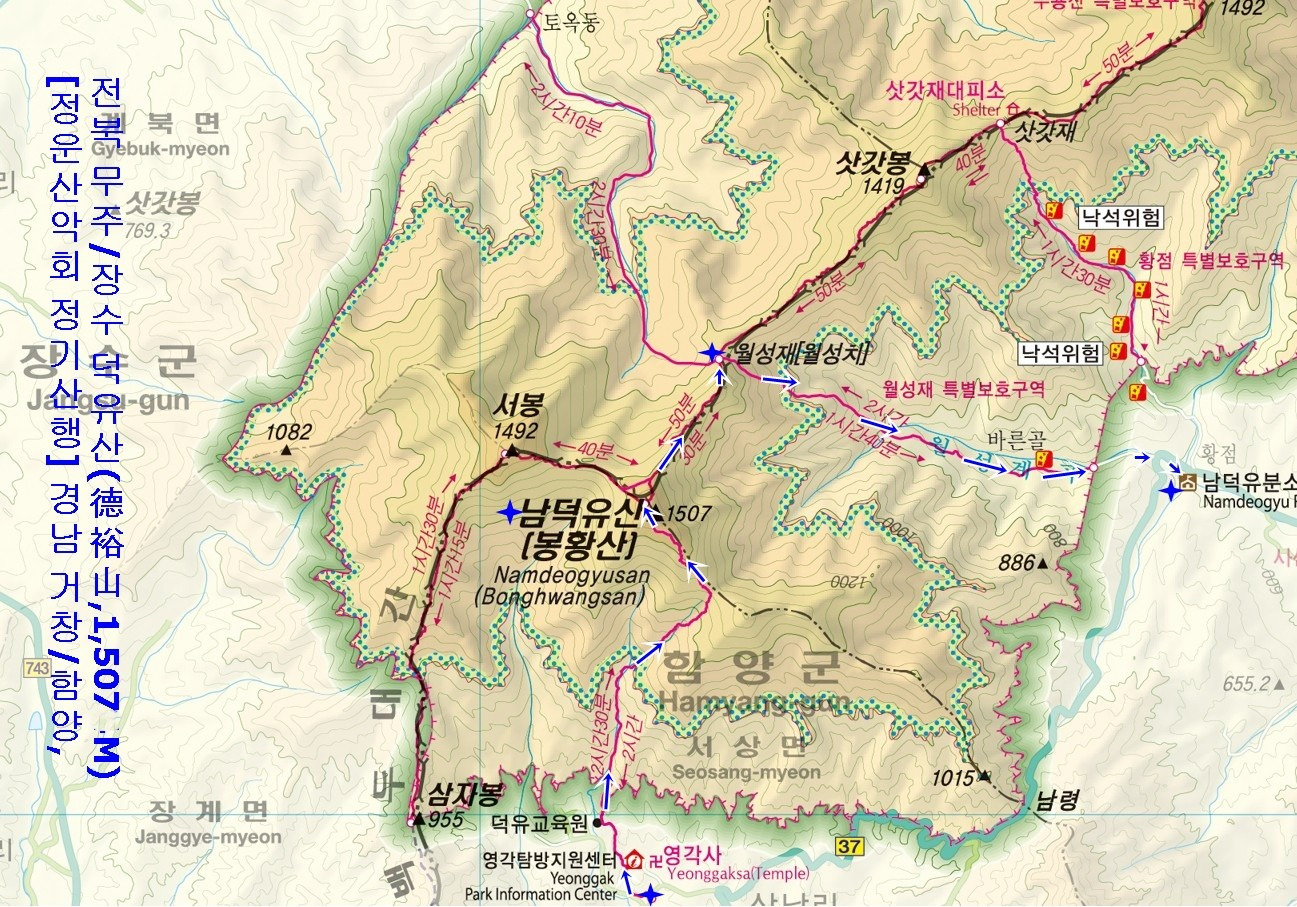 | 산행시간 | 06시 35분 인천 최종 출발 휴게소에서 아침식사 10시 30분 영각사버스정류장 도착 / 산행 시작 13시 30분 남덕유산 도착 / 식사 14시 30분 월성재 도착 16시 00분 하산완료 17시 30분 식사 후 인천 출발 21시 00분 인천 도착 ◈ 진행계획은 대략적인 목표치로 실제는 상당히 차이가 발생할 수 있습니다. ◈ 탐방로 구간 소요시간은 일반적인 평균치로 개인별/기상별 여건에 따라 가감될 수 있습니다. |