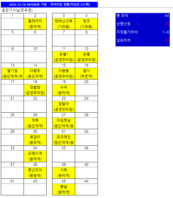 | 안내사항 | 1. 산행대장의 리딩에 따라 주시고, 개별행동을 할 시에는사전에 허락을 받으셔야 합니다. 2. 불의의 사고 및 안전을 위해 산행대장 및 총무의 전화번호를 꼭 입력하여 두시고, 통화가 안될시 문자를 통해 도움을 요청하셔야 합니다. 3. 산행시 사망, 부상 및 기물파손 등의 손해 발생시 사고자의 책임으로 하고 정운산악회에서는 민·형사상의 책임을 지지 않습니다. 4. 산행비 중 남는 금액이 있을시는 산악회 통장에 입금하여 산악회 발전을 위해 사용하도록 하겠습니다. 5. 기타 정해지지 않은 내용은 정운산악회 회칙과 산우님과의 약속의 의거 진행합니다. 6. 차내 음주가무 등 소란행위는 허용되지 않으며, 여행자보험은 참가회원 각자 가입해야 합니다. 7. 좌석은 아래 그림을 참조해 주시고 산행 신청시 (탑승지 및 좌석 번호)를 기재해 주시기 바랍니다.(#1 ~ #8 : 지정불가) |