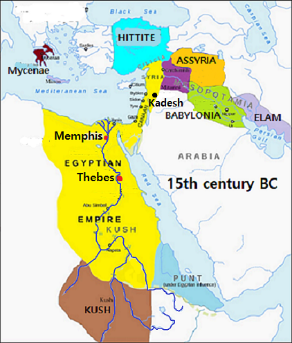 BC 1650년경 지금의 팔레스타인 방면에서 이집트로 침입해온 힉소스(Hyksos) 족이 북부 지역을 정복하고 100년 동안 지배했다. 힉소스 왕조의 도읍은 나일강 델타에 위치한 아바리스(Avaris)였다. 이집트인들은 남부 지역의 테베(룩소르)를 도읍으로 해서 제17 왕조를 세우고 힉소스에 맞서 싸웠다. 제17 왕조의 남쪽 누비아(Nubia 지금의 수단)에는 흑인의 나라 쿠시(KUSH, CUSH) 왕국이 존재했다.