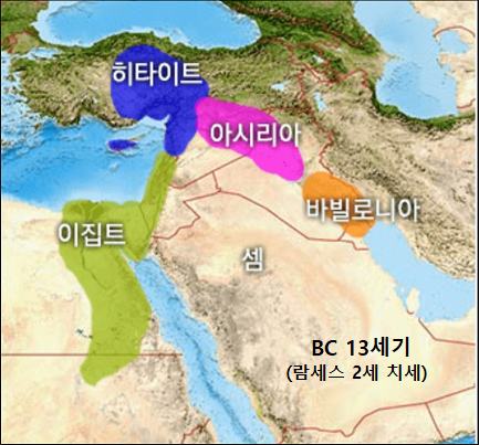 투트모세 3세가 죽은지 100년 후 이집트는 북방의 히타이트(Hittites) 왕국에게 시리아를 빼앗기고 남쪽에서는 쿠시왕국이 독립했다. 쇠약해진 제18 왕조는 BC 1293년에 끝나고 제19 왕조가 뒤를 이었다. 제19 왕조의 람세스 2세(Rameses/Ramses : 재위 BC 1279~1213)는 BC 1303년에 출생하여 24세에 왕위에 올라 BC 1213년에 90세로 죽었다. 람세스 2세는 즉위 초 나일강 델타 지대에 라메세스를 건설하여 북부지역의 거점으로 삼았다. 람세스 2세는 선대에 상실했던 시리아를 수복하기 위해 히타이트를 상대로 수 차례 원정을 감행했으나 실패했다. BC 1274년의 카데시(Kadesh) 전투가 가장 유명한데 람세스 2세는 비록 패배했지만 가나안 땅을 지켰다.