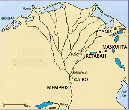 같은 시기에 타니스에서 남쪽으로 50 km 떨어진 텔 엘 레타바(Tell El Retabah)와 거기서 15 km 동쪽 텔 엘 마스쿠타(Tell El Maskhuta)에서 고대 도시의 유적이 발굴되었다. 고고학계는 두 곳 중에 하나가 성서에 기록된 피톰(Pithom)일 것으로 보았지만 명확한 증거는 나오지 않았다.