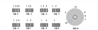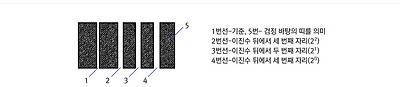 아래 '미국 특허' 그림에서 그림.2는 기준선 외에 세 개의 선이 다 그어져 있으므로 111(2),이고, 이는 1*22+1*21+1*20=7을 나타낸다. 그림.3은 기준선과 2번 선과 3번 선이 있고 4번 선은 없으므로 110(2)=이 되어 1*22+1*21+0*20=6이 된다. 이와 같이하면 그림.4는 101(2)=1*22+0*21+1*20=5, 그림.5는 100(2)=1*22+0*21+1*20=4를 나타낸다. 그리고 이들은 십진수로 환산된 숫자에 물건에 대한 정보를 대응시켜 정보를 표시할 수 있게 하였다. 기준선을 제외한 줄의 수가 3개인 이 경우 0~7인 8가지를 표시할 수 있지만, 한 자리수가 더 늘어나 네 자릿수가 되면 8(=23)가지를 더 표현할 수 있다. 이같이 줄의 수를 늘림으로 간단히 정보의 수를 기하급수적으로 표시할 수 있게 했다. 실버와 우드랜드는 정보를 나타내는 줄의 색을 달리하거나 직선으로 된 줄을 변형하여 그림.10과 같은 동심원(Bull's eye로 불림)으로도 정보를 표기할 수 있다고 했다. | |