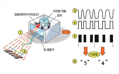 바코드에 있는 정보를 읽어내는 시스템에는 스캐너, 디코더 및 컴퓨터가 포함되어 있다. 스캐너에는 레이저 빛을 쏘는 부분과 빛을 검출하는 부분이 있다. 바코드에 빛을 쏘면(①) 검은 막대 부분은 적은 양의 빛을 반사하고, 흰 부분은 많은 양의 빛을 반사한다.(②) 스캐너는 반사된 빛을 검출하여 전기적 신호로 번역되어 이진수 0과 1로 바뀌어 진다.(③④⑤) 이는 다시 문자와 숫자로 해석되어진다.(⑥) 이는 디코더에 의해 컴퓨터가 바코드를 수집할 수 있는 형태로 변환한 뒤에 호스트컴퓨터로 데이터를 전송하게 된다. | |