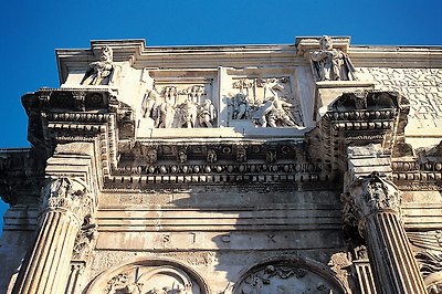 절정은 아치 주변의 벽면이었다. 역사적 사건과 승전 등을 찬양하는 돋을새김 장식이 벽면을 가득 뒤덮었다. 개선아치는 찬양의 대상이 되는 황제의 이름이 붙게 되는데 포룸 로마눔에 세워진 티투스의 아치와 셉티미우스 세베루스의 아치 등이 대표적인 예이다. 개선아치의 장식주의는 콘스탄티누스의 아치에서 절정에 이른다. 콘스탄티누스가 막센티우스와의 권력 투쟁에서 승리한 것을 기념해서 세운 것인데 정치적 야심이 큰 황제였던 만큼 자신의 정치적 권위 뿐 아니라 기울어가는 로마 제국의 권위도 자랑하는 기회로 삼고자 했다. 그러나 당시 로마는 너무 많이 기울어가고 있었고 새로운 돋을새김을 축조할 경제력이 부족했기 때문에 선대 황제들의 건물에서 장식물을 떼어다 벽면을 가득 채울 수밖에 없었다. | |