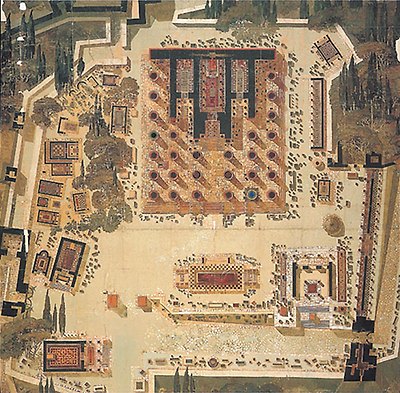 주피터 카피톨리누스 신전(Temple of Jupiter Capitolinus) - J. 카를뤼(J. Carlu)의 1924년 그림이다. 로마 신전은 이미 초창기부터 그리스 신전과 달리 무대 장면을 보는 것처럼 계획되었다. |