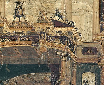 헤르쿨라네움(Herculaneum)에서 발견된 벽화 그림 - 나폴리 근교. 서기 63-79년. 조각 페디멘트를 보여주는데 이 기법은 실제로 17세기 바로크건축에서 가장 많이 사용하는 어휘가 되었다. |