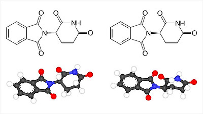 탈리도마이드 분자는 광학이성질체를 가진다. 왼쪽의 (S)-탈리도마이드는 유전자 변형을 일으켜 기형아 출산의 원인이 되며,