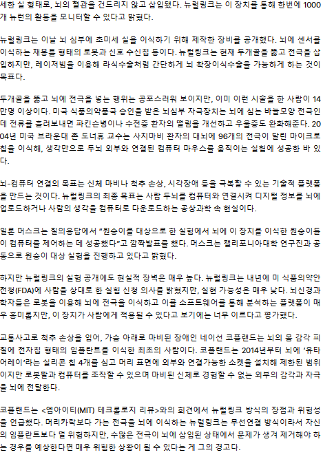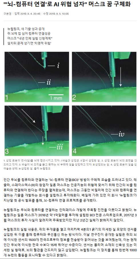 2019.8.4. "'뇌-컴퓨터 연결'로 AI 위협 넘자" 머스크 꿈 구체화