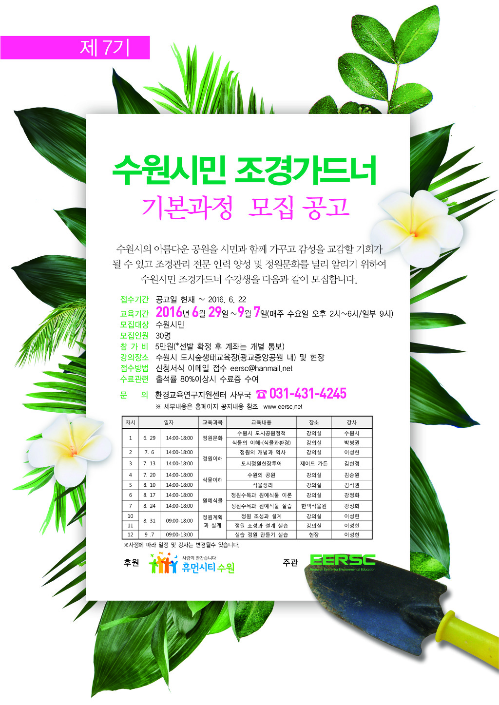 수원시민 조경가드너 교육생모집 안내 작성자EERSC|작성시간16.06.21|조회수78 목록 댓글 0 글자크기 작게가 글자크기 크게가 조경가드너 7기 수강생 모집 공고.hwp 첨부파일첨부된 파일이 2개 있습니다. jpg 파일 수정_환경교육 가드너-2016.jpg 다운로드 hwp 파일 조경가드너 7기 수강생 모집 공고.hwp 다운로드 다음검색 현재 게시글 추가 기능 열기 북마크 공유하기 신고 센터로 신고 댓글 댓글 0 댓글쓰기 답글쓰기 댓글 리스트