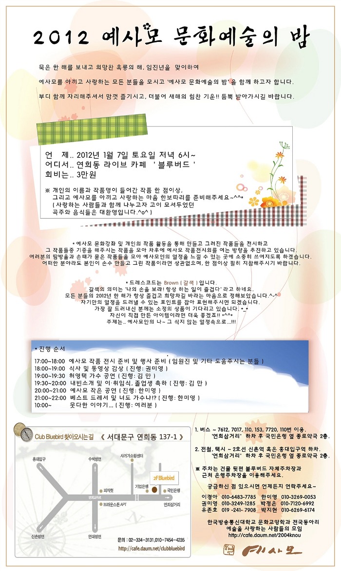 2012 예사모 문화예술의 밤 작성자이경아(08경기)|작성시간11.12.30|조회수186 목록 댓글 22 글자크기 작게가 글자크기 크게가 다음검색 현재 게시글 추가 기능 열기 북마크 신고 센터로 신고 댓글 댓글 22 댓글쓰기 답글쓰기 댓글 리스트 답댓글 작성자이경아(08경기) 작성자 본인 여부 작성자 | 작성시간 12.01.05 홍어회무침준비 감사합니다~^^ 답댓글 작성자백기자(04서울) | 작성시간 12.01.06 꼴깍~ ㅎㅎ 작성자이미영(서울06) | 작성시간 12.01.06 정화랑 함께 참석할게요~ 답댓글 작성자이경아(08경기) 작성자 본인 여부 작성자 | 작성시간 12.01.07 내일 뵐게요.^^ 작성자정경회(10서울) | 작성시간 12.01.06 내일 뵐게요^^* ㅎ 댓글 전체보기