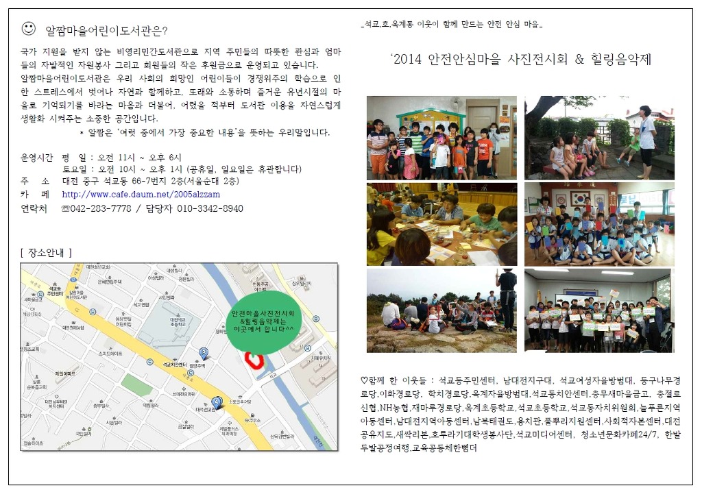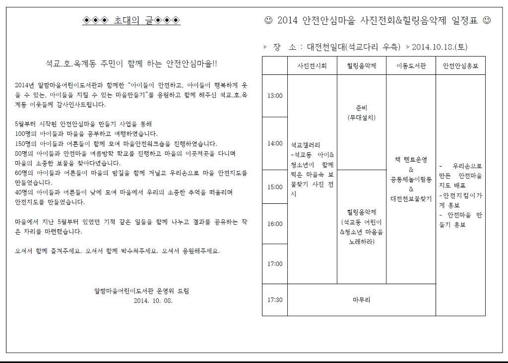 [알려드립니다.]2014년 10월 18일 안전마을 사진전시회& 힐링음악제 많이 놀러오세요^^ 작성자알짬지기|작성시간14.10.14|조회수101 목록 댓글 0 글자크기 작게가 글자크기 크게가 민 다음검색 현재 게시글 추가 기능 열기 북마크 공유하기 신고 센터로 신고 댓글 댓글 0 댓글쓰기 답글쓰기 댓글 리스트
