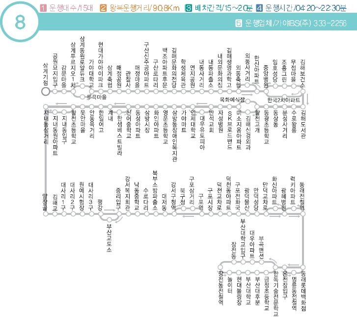 삼계기점 - 공원묘지입구 - 감분마을 - 삼계푸르지오1차 - 삼계동원로얄듀크 - 가야대학교 - 현대가야아이파크 - 삼계축협 - 매정공원 - 관찰사 - 구산신주공아파트 - 구산교차로 - 구산백조아파트후문 - 김해문화의전당 - 학생체육관 - 연지공원 - 내동사거리 - 내외문화의집 - 김해생명과학고 - 외동축협 - 한신아파트 - 중앙병원 - 임호성당 - 조흥그린 - 무접마을 - 김해보건소 - 박물관역[외동터미널] - 김해도서관 - 수로왕릉 - 분성사거리 - 동상동 - 동광초등학교 - 활천고개 - 김해신경외과 - 미소지움아파트 - SK브로드밴드 - 자성병원 - 반석교회 - 인제대학교 - 가야마트 - 삼방동장애인복지관 - 영운초등학교 - 화인아파트 - 삼방시장 - 동성아파트 - 신어중학교 - 계내 - 한일여고 - 안동육거리 - 못안마을 - 활천초등학교 - 지내동삼거리 - 양장골 - 선암다리[불암역] - (김해교) - [부산시]대사리1구 - 대사리2구[대사역] - 원예시험장 - 대사리3구 - 평강역 - 중리입구 - 강서복지회관 - 낙동중학교 - 수로다리 - 북부소방파출소 - 대저동 - 도시철도 강서구청역 - (구포대교) - 북구청 - 구포삼거리 - KTX구포역[도시철도 구포역] - 구포시장 - 덕천교차로[도시철도 덕천역] - 덕천아파트[도시철도 숙둥역] - 구포전화국 - 광덕물산[도시철도 남산정역] - 만덕성당 - 만덕교차로[도시철도 만덕역] - (만덕2터널) - 광혜병원 - 도시철도 동래역 - 롯데백화점동래점[도시철도 명륜역] - 온천장입구[도시철도 온천장역] - 한독기술전문학교 - 부곡맨션 - 대우아파트[도시철도 부산대역] - 부산대학교입구 - 장전동 - 도시철도 장전역
