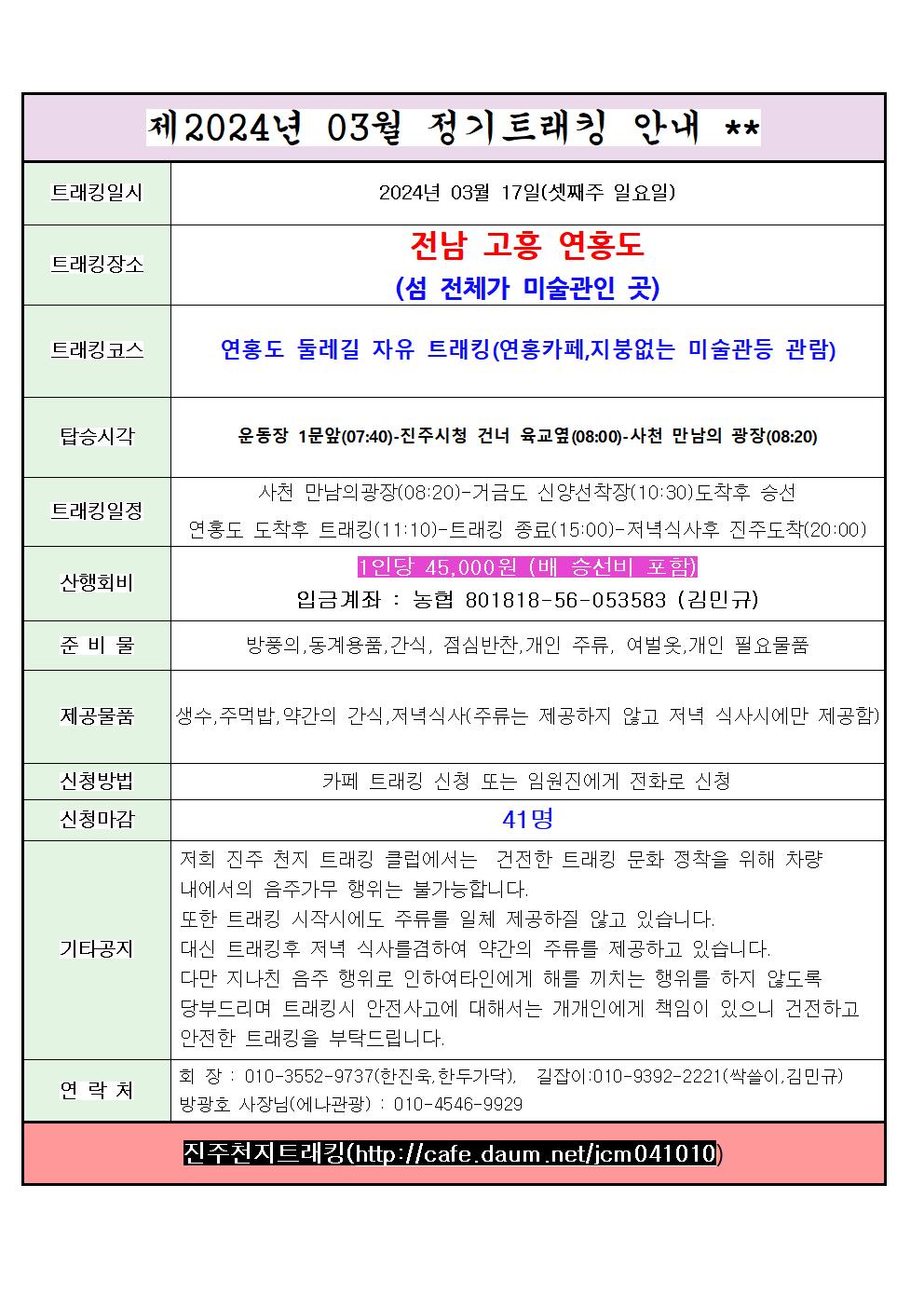 [스크랩] 2024.03. 전남 고흥 연홍도 섬 트래킹 안내(2024.03.17) 작성자싹쓸이|작성시간24.03.11|조회수25 목록 댓글 0 글자크기 작게가 글자크기 크게가 다음검색 스크랩 원문 : [[진주천지워킹(도보)클럽]] 현재 게시글 추가 기능 열기 북마크 공유하기 신고 센터로 신고 댓글 댓글 0 댓글쓰기 답글쓰기 댓글 리스트