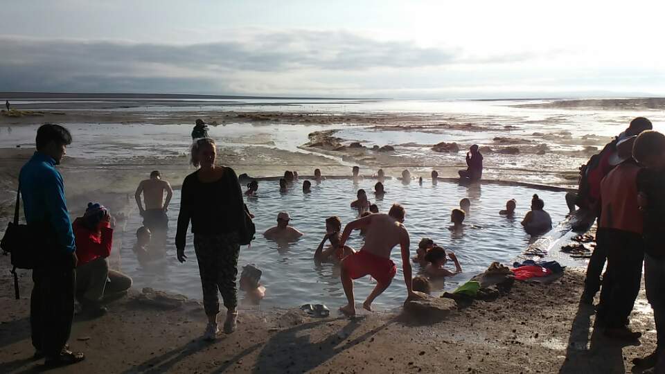마지막으로 도착한 곳은 따뜻한 물이 펑펑 솟아오르는 노천탕 인데 젊은이들은 수영복 차림으로 온천을 즐긴다.