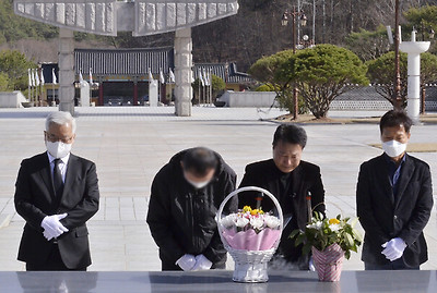 ◇ <△ 사진:> 5·18 진압에 참여한 공수부대원 ㄱ씨가 국립 5·18민주묘지 참배광장에서 참배하고 있다. 왼쪽부터 송선태 조사위 위원장, ㄱ씨, 고 박병현씨 두 형제. 5·18 민주화운동진상규명조사위 제공