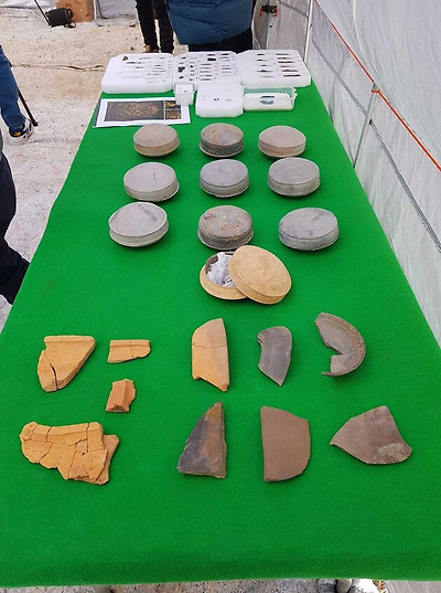 ◇ 지난해 10월부터 올해 2월까지 조사한 장고봉 고분의 주요 출토품들. 원래 묻은 부장품은 대부분 도굴당했으나 이번에 뚜껑 달린 토기 접시(개배)와 아궁이틀 조각, 철제 갑옷과 철촉의 파편 등이 상당수 나와 무덤 주인을 추정하는 단서가 될 것으로 보인다.