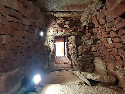 ○··· 내부 석실은 길이와 너비가 각각 4m를 넘고 천장까지의 높이는 2m에 달하는 큰 공간이다. 하단부에 길쭉한 판석을 놓고 위쪽에 깬돌을 차곡차곡 올려 벽체를 쌓는 고대 서일본 규슈지역의 무덤 석실과 얼개가 똑같다.