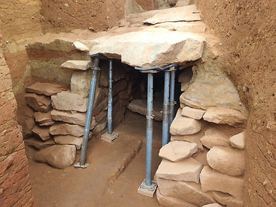 ◇ 무덤 석실로 들어가는 연도(널길 통로)의 들머리 부분 발굴현장. 토압에 따른 붕괴 위험에 대비해 윗부분 덮개돌 아래 금속지지대를 받쳐놓았다.