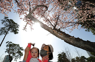 ○··· 17일 오후 서울 송파구 석촌호수에서 아이가 꽃을 보고 있다.