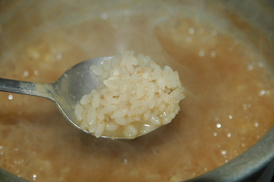 된장물에 마늘을 조금 넣고 불린 쌀을 넣어 가끔씩 저어가면서 끓기 시작하면 약불에 놓고 끓입니다.