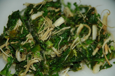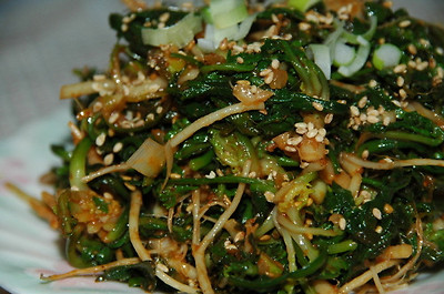 무침할것은 끓는 물에 소금 조금 넣어 시금치 데치듯이 살짝 데쳐서 찬물에 두 세번 헹궈 물기를 꼭 짜서 먹기 좋게 두 세번 잘랐어요. 초고추장은 대체로 고추장의 반 만큼의 식초와 설탕(물엿과 반씩 나누어도 되요)을 섞으면 되는데, 맛을 봐가며 가감하면 거의 실패하지 않더군요. 마늘과 송송 썬 파와 초고추장을 넣고 조물 조물 무칩니다.