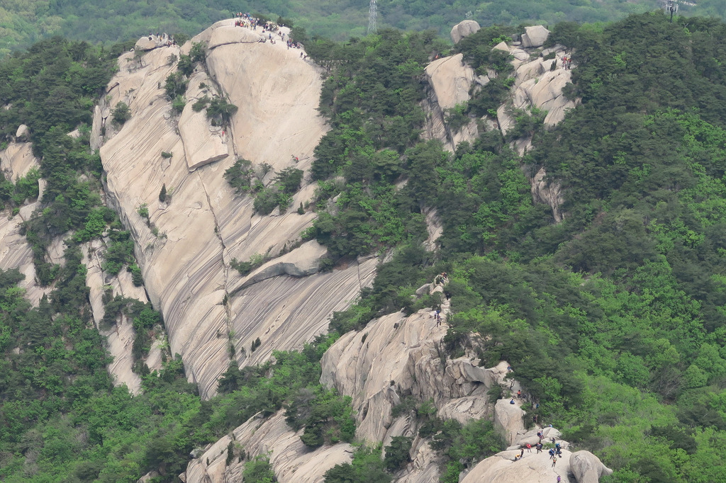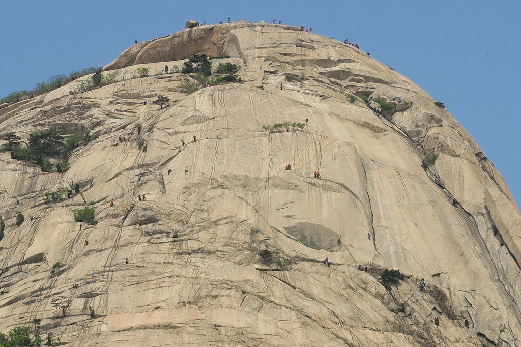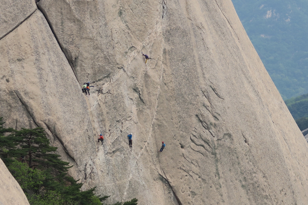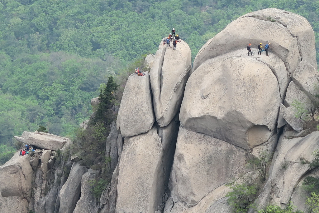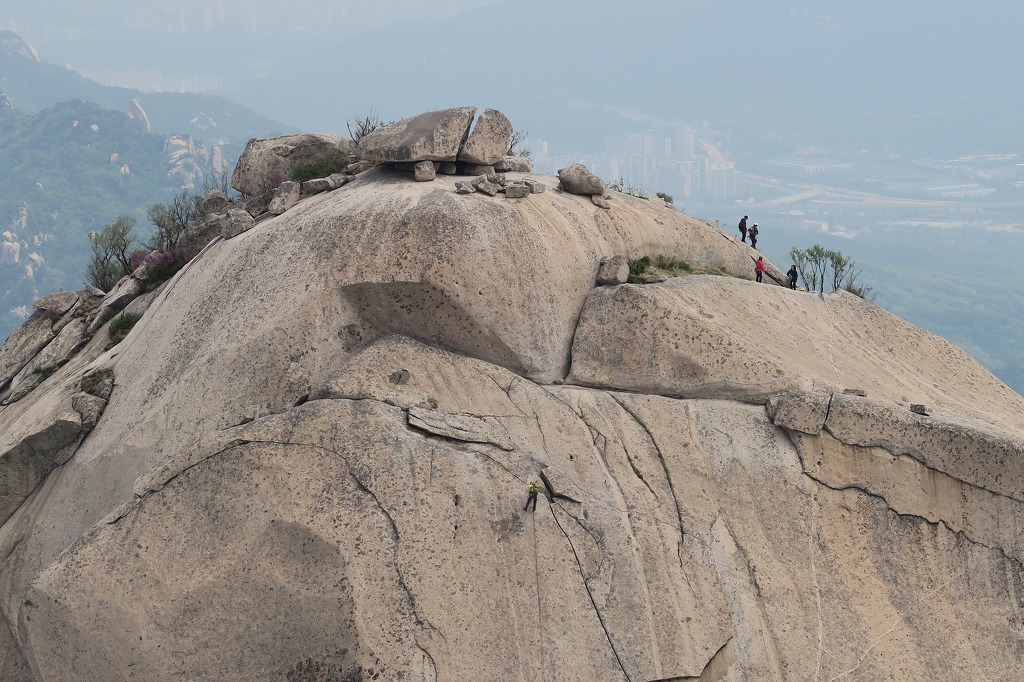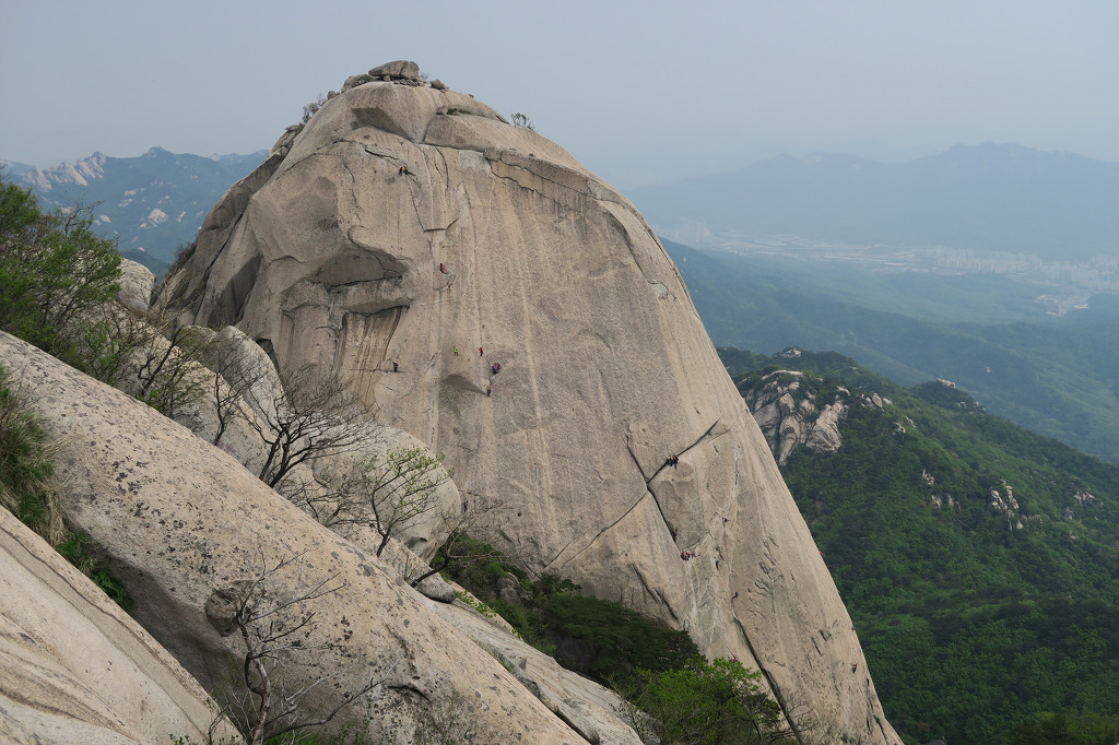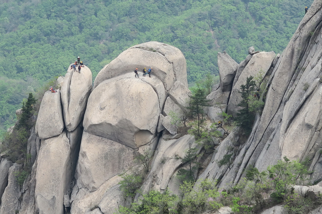 백운대 오름길에 바라본 인수봉 암벽등반 등산객 모습