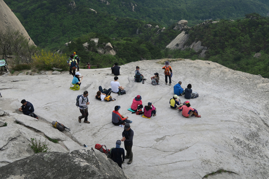 정상 부근 넓적한 바위에서 쉬고 있는 등산객 들....