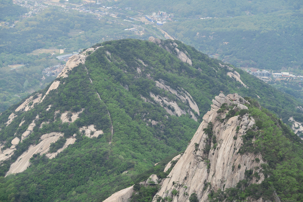 북한산 백운대에서 바라본 원효봉(왼쪽 봉우리)과 염초봉(가운데 뾰족한 바위 봉우리)