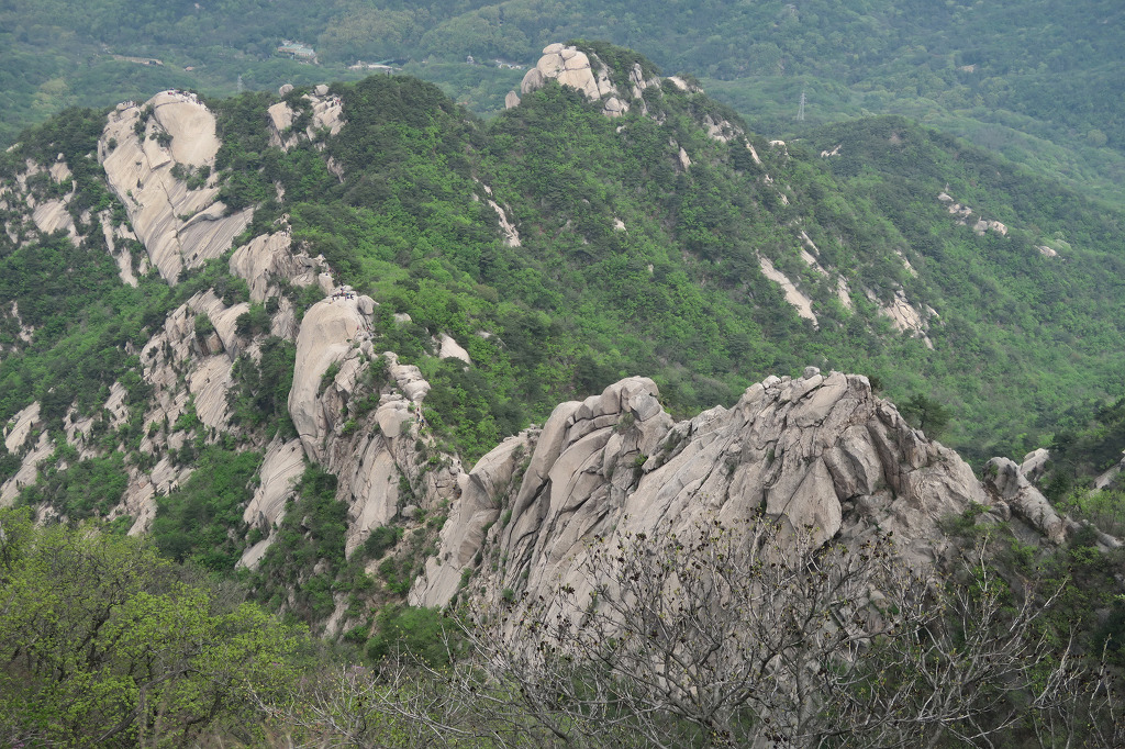 정상에서 바라본 노적봉(앞쪽의 바위 봉우리)과 보현봉(멀리 보이는 왼쪽 높은 봉우리)