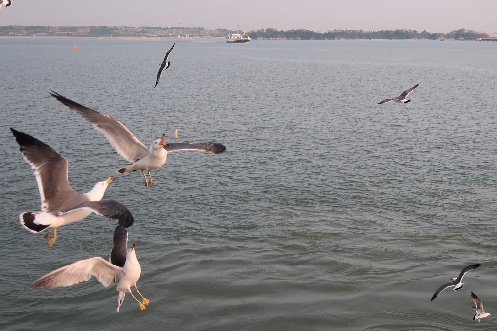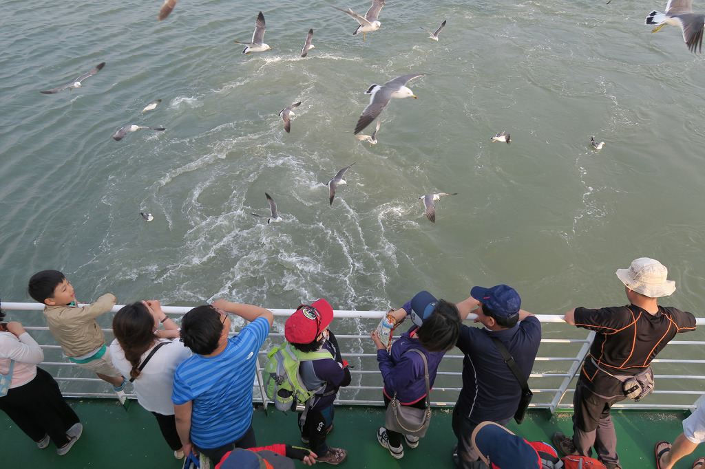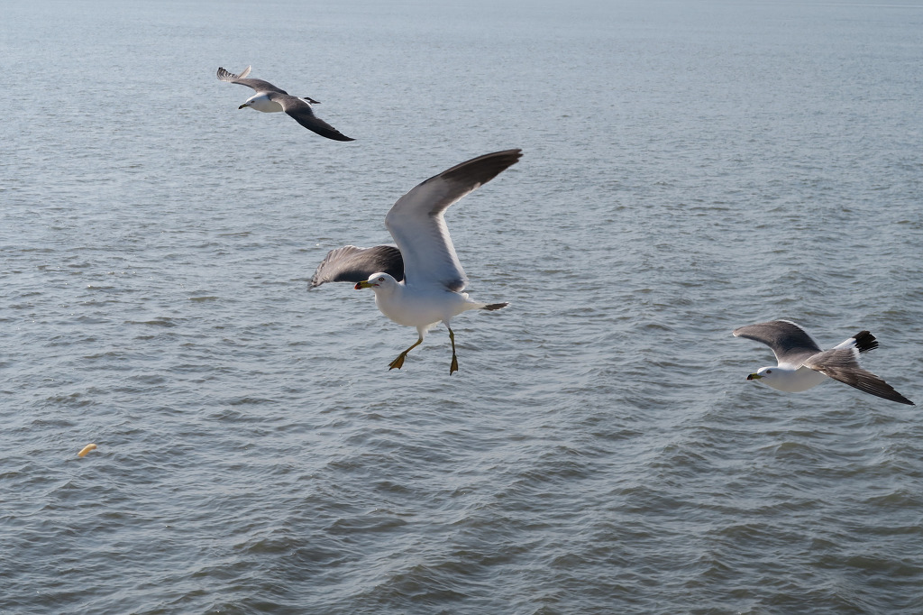 새우깡 쟁탈전. 빠르고 날쌘 갈매기가 먹이를 낚아 채간다.
